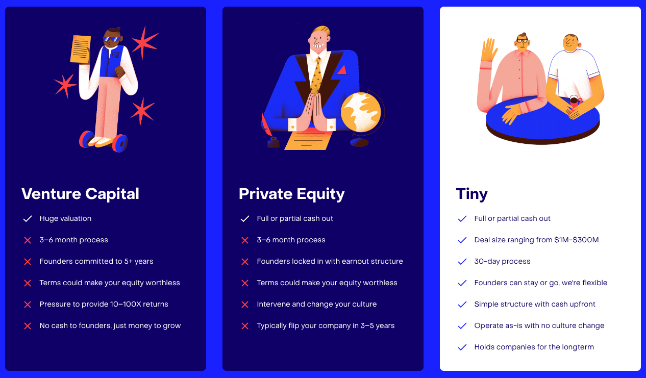 Tiny is my favorite example of using a website to demonstrate unique positioning vs other sources of capital. Tiny utilizes web components that are commonly used by SaaS companies, not investors. For example, they use product comparison cards to showcase the difference between Tiny and Venture Capital / Private Equity.