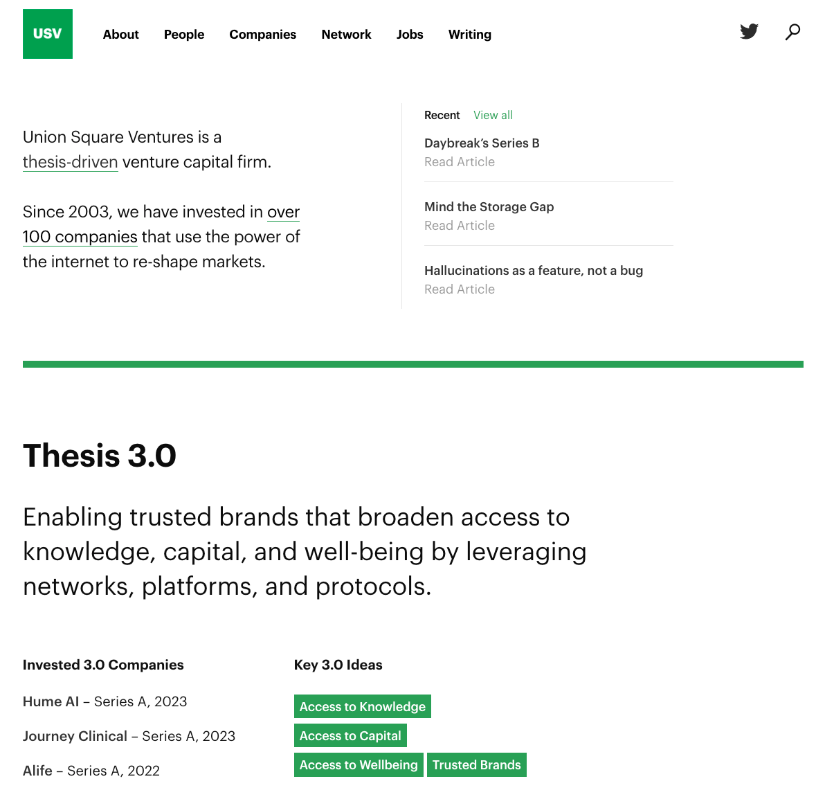 USV wants to convey that their investment company has unique and smart ideas generated by smart investors. At first glance, USV's website seems to cater exclusively to potential LPs. But, conveying a sense of focus and discipline that’s detached from personality or fads can itself be a differentiator to founders. Also, if you are a founder who took a thesis based approach to searching for startup ideas, you might be drawn to an investment company that values and believes in the same things.
