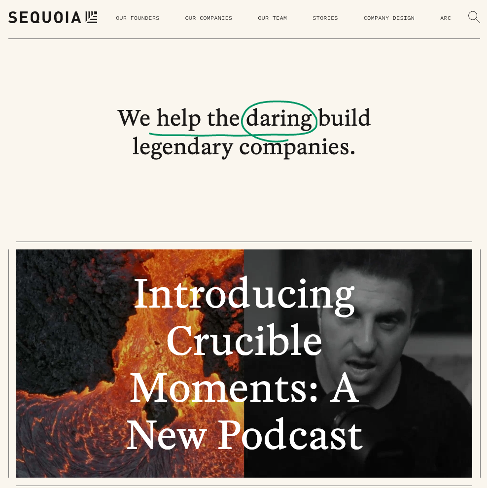 From the header copy Sequoia refers to founders as "daring". And, Sequoia’s role is to help those daring people become "legendary". Their content section features their “Crucible Moments” podcast that discusses key inflection points at startups. On the navbar the first linked page is to “Our Founders”, which spotlights the individuals behind the companies, not the companies themselves. In my opinion Sequoia lionizes founders a bit too much, but I get the appeal.