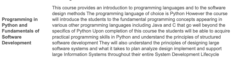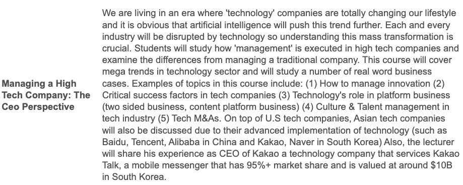 MBAs are learning to code!?! I couldn't believe my eyes when I saw a whole slew of courses like "Programming in Python and Fundamentals of Software Development" that actually taught programming. That's awesome, and a big departure from what existed 10-15 years ago. Students who finish the course will have a better mental model of how software is built and more empathy for engineers. The course requires students to learn a good amount of Python, which is a huge turnoff for most MBAs. My guess is the folks who take this course are more inclined towards entrepreneurship and are less of the "I want to be CEO soon" crowd.