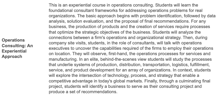 "Operations Consulting: An Experiential Approach" is a course that doesn't teach anything related to software engineering. But, it's worth calling out because it forces MBAs to play the role of consultant to real life companies and clients. In this course it's focused on consulting for manufacturing businesses. It would be great to see this for software engineering.